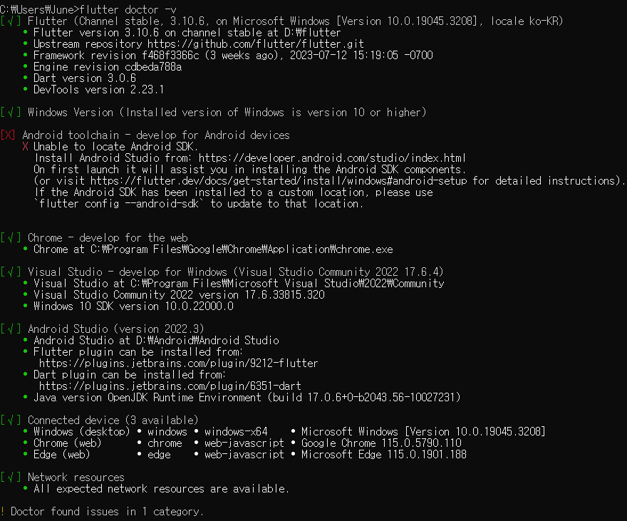 'flutter doctor -v' 명령 실행 시 아래와 같은 오류가 발생할 수 있다.